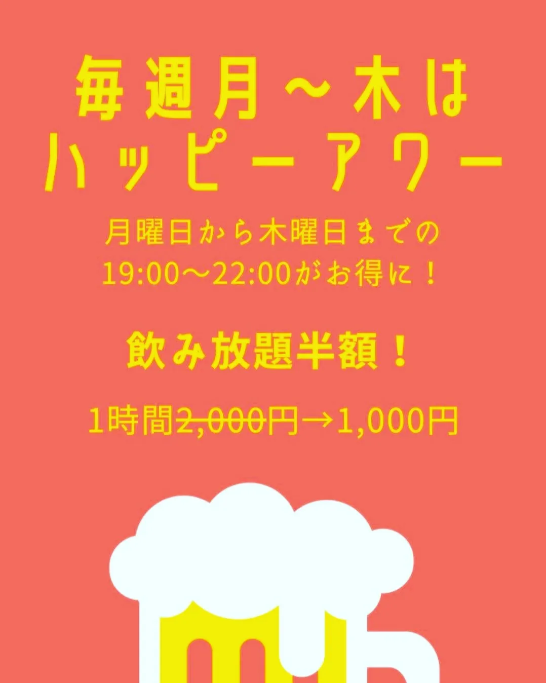 週のスタートを乗り切ったご褒美として、ハッピーアワーでお得な価格で普段よりも一層楽しいひとときを過ごせるはずです✨